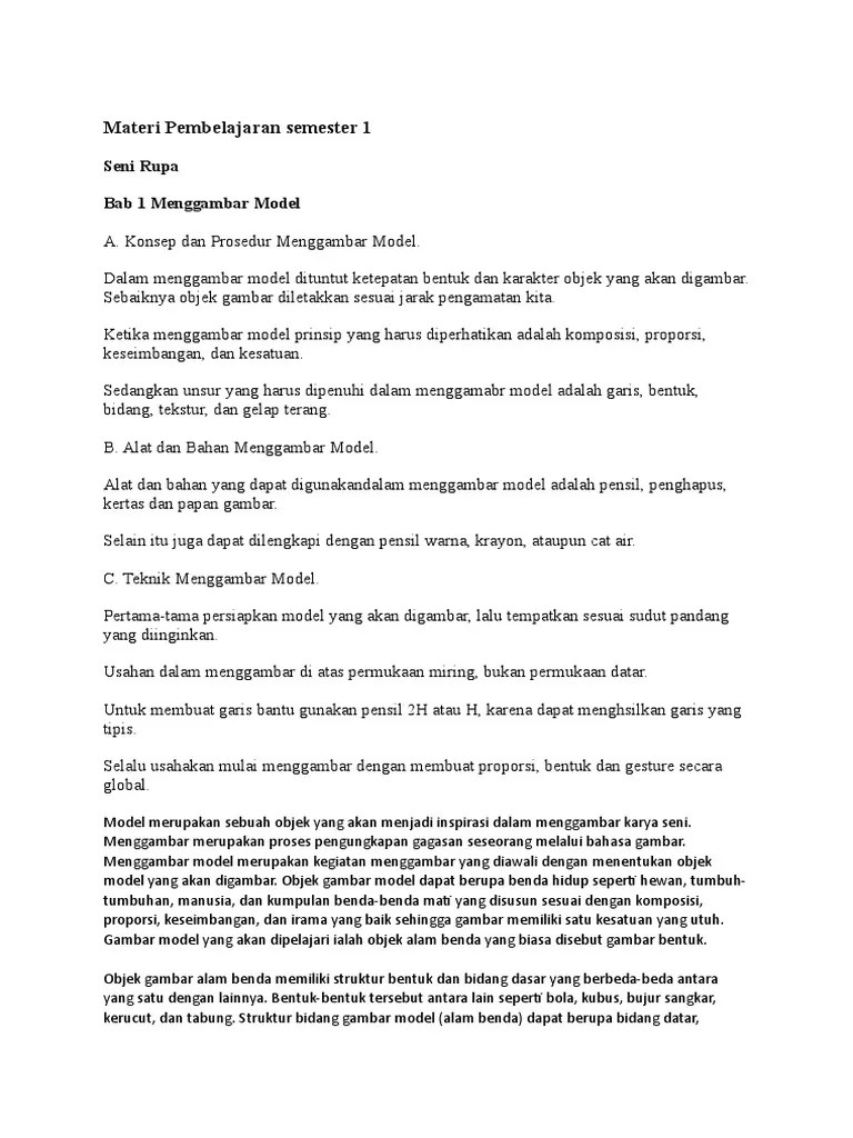 Materi seni budaya kelas 7 smp dan mts bagian seni rupa bab 1 menggambar model, seni budaya kelas vii smp/mts. Menggambar dengan model berupa flora, fauna, alam benda. Menggambar model merupakan salah satu kesenian di bidang seni rupa, di dalam bidang ini dibutuhkan penguasaan teknik yang beragam jenisnya. Mengidentifikasi setiap jenis objek gambar model. Video pembelajaran seni budaya kelas viiiseni rupa kurikulum 2013 revisi 2017menggambar model adalah kegiatan menggambar yang menggunakan .